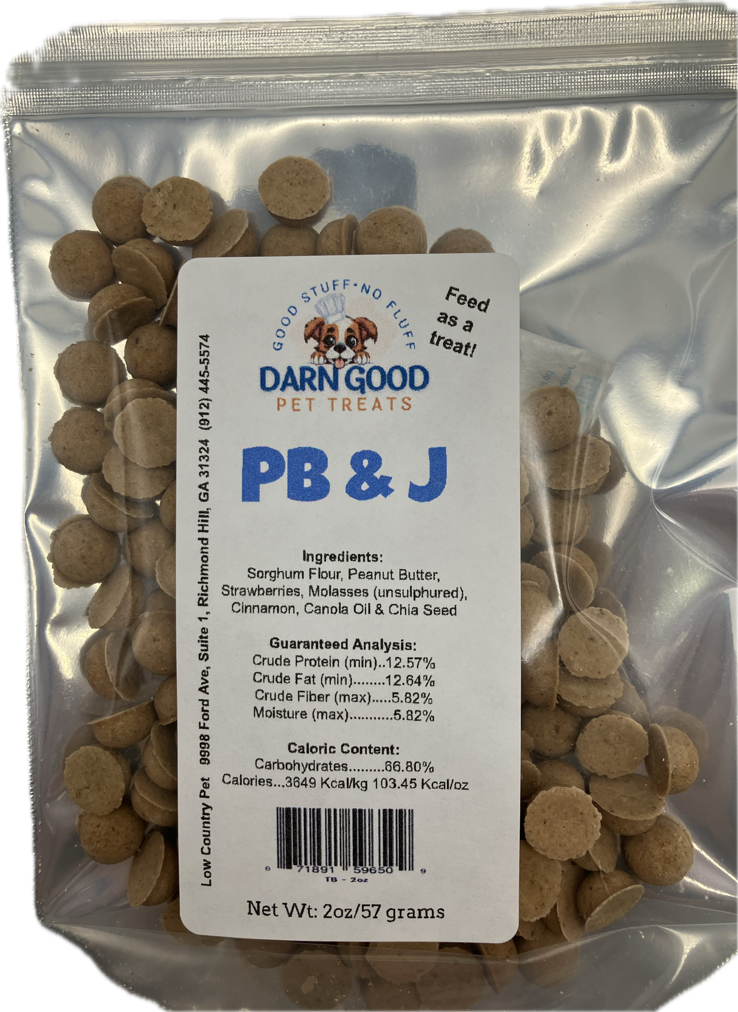 Introducing Darn Good Pet Treats Peanut Butter & Jelly Dog Cookies, a delightful and wholesome treat that perfectly captures the classic flavors loved by humans, now specially formulated for your furry companion. These bone-shaped biscuits, ideally sized at 1.5 inches, combine the rich, creamy taste of peanut butter with the sweet and fruity essence of jelly, creating a unique and tantalizing snack that's both nutritious and irresistible to dogs.